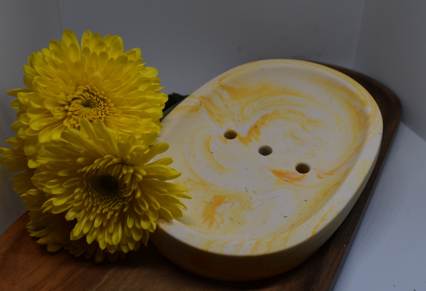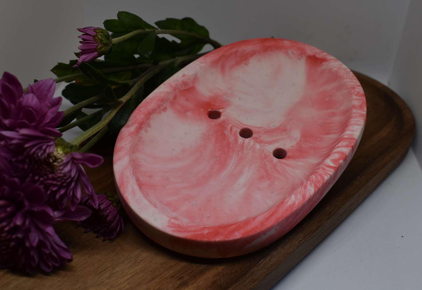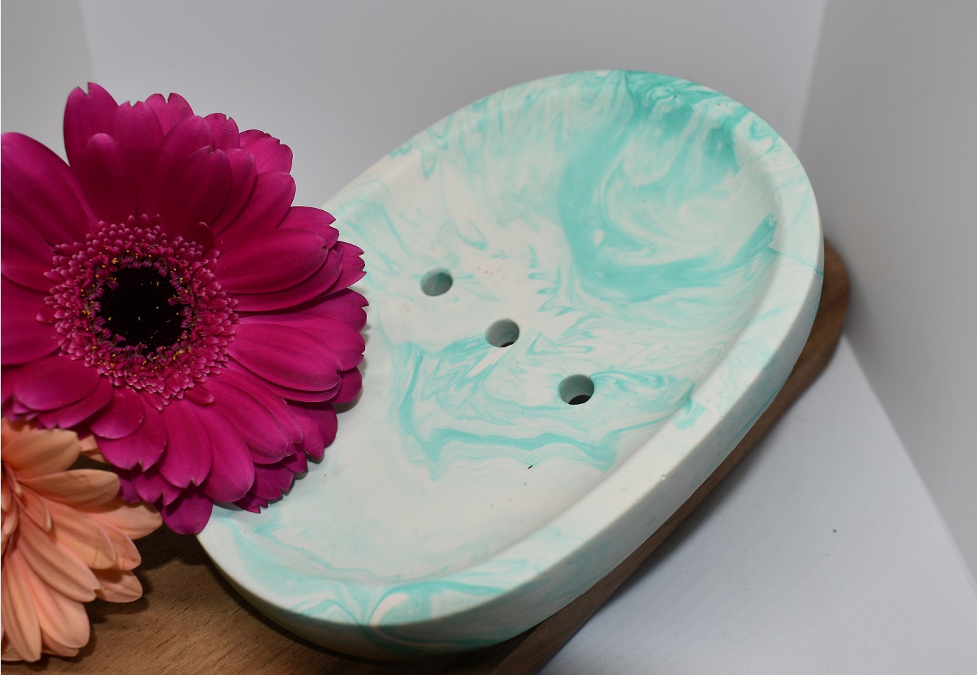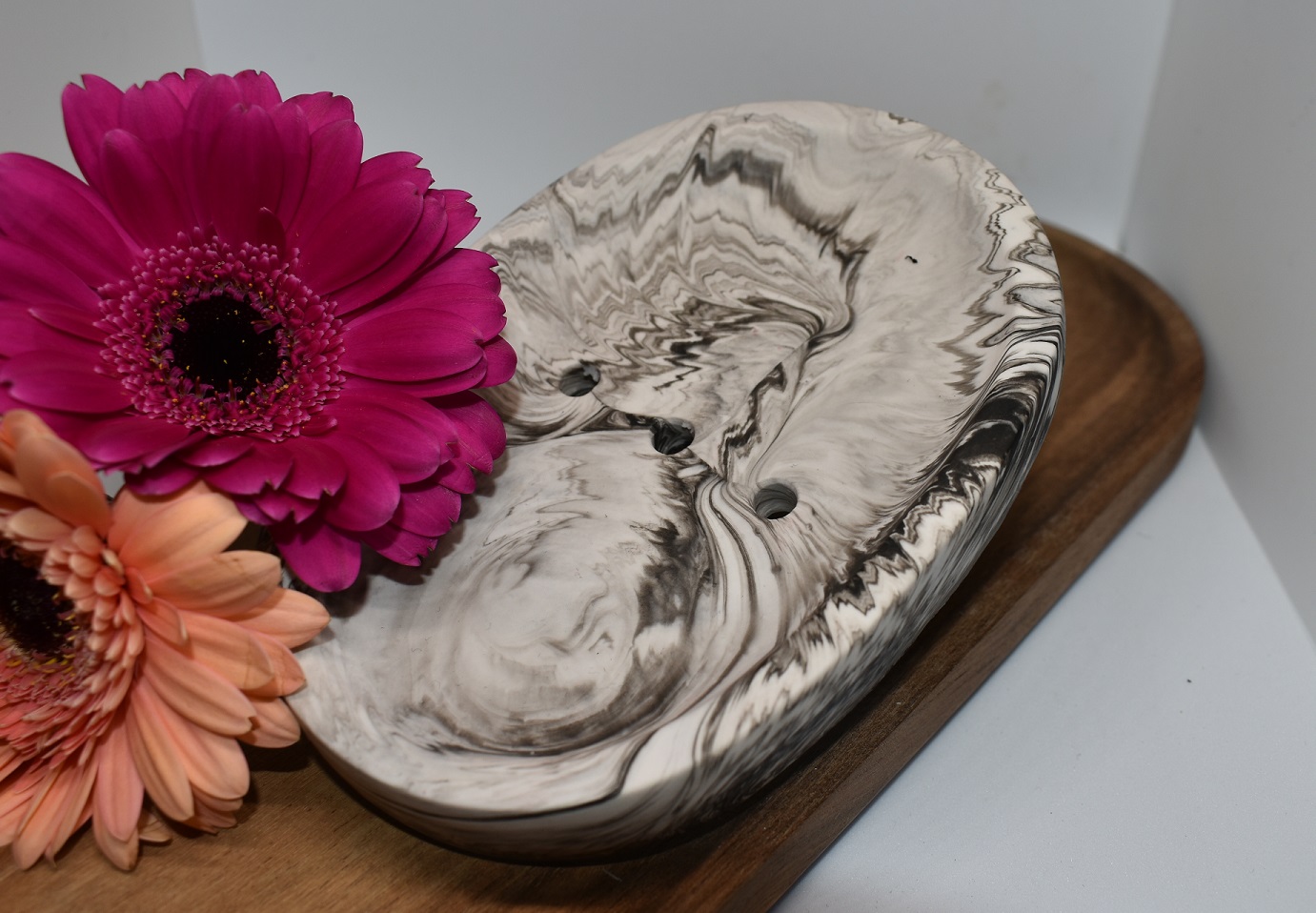 Ovale, handgefertigte Seifenschale aus Keraflott bzw. Jesin – marmoriert, matt und wasserabweisend. Mit Ablauflöchern für eine trockene Seife – die perfekte Ergänzung zu meinen Naturseifen.